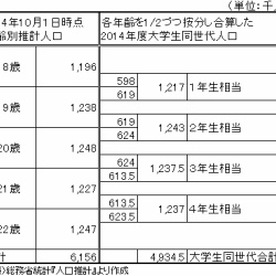 前回示した各大学の在籍学生数を2014年の平均偏差値別に並べて、上位からの累積学生数を計算して、それを同世代の総人口で割ってみた。 ここで、同世代の人口は、総務省統計局の人口推計での2014年10月1日時点の18~22歳人口をもとに、4月からの半年間で半分が年齢が ...
