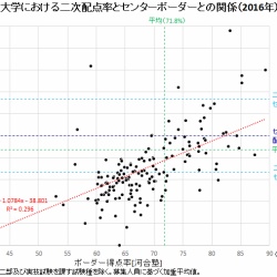 前回、プロット図で使いました河合塾発表の今年のセンター試験の各試験種ごとのボーダー得点率(合格可能性が50%と予想されるセンター試験の得点率)を大学ごとに募集人数で加重平均した値を参考までに載せておきます。 センターで課せられてる教科・科目の種類や数、配 ...
