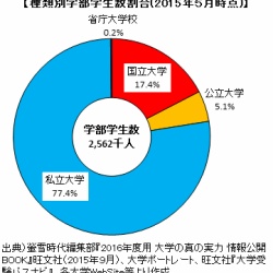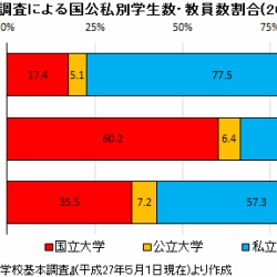前に学部学生数の大学別順位を提示しており、さらに以前には大学院生数の順位も出しておりました。 そこで、これらについて国立・公立・私立等の割合を出してみました。(各ページにも画像追加) 学部学生については、約256万人いますが、その8割弱を私立大学が占めて ...