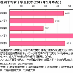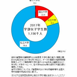 昨年版に引き続き、先に示した学部在籍学生数のうち、2017年5月1日時点の女子学生の在籍学生数について抽出しました(通信制は除く)。 なお、性別学生数非公表の私立8大学を除いた学部在籍の女子学生数は1,156,115人であり、うち約8割(79.6%)が私立大学の学生です ...