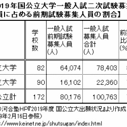もはや国公立大学二次の前期試験が明日なのに、今更関係ないって感もなきにしもあらずですが、今年の国公立一般入試募集人員に占める前期分の割合を算出してみました。明日の前期のみって国公立大学は16校あります。 なお、前期分の割合は、国立平均81.7%、公立平均72. ...