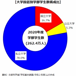 昨年度の文部科学省の『学校基本調査』より、四年制大学の学部学生数(通信制課程と省庁大学校を含まない)は262.4万でした。これを設置別内訳をみると、国立大学が16.7%、公立大学が5.3%、私立大学が78.0%を占めていました。 さらに学部学生数を大学学部の所在する ...