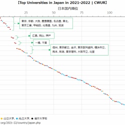 The Center for World University Rankings (CWUR)より2021-22年版の世界大学ランキングが発表されていたので、載せておきます。世界2000位以内に日本からは124校がランクインしており、内訳は、国立大学が60校、公立大学が12校、私立大学が51校、省庁大学校が1校となって ...